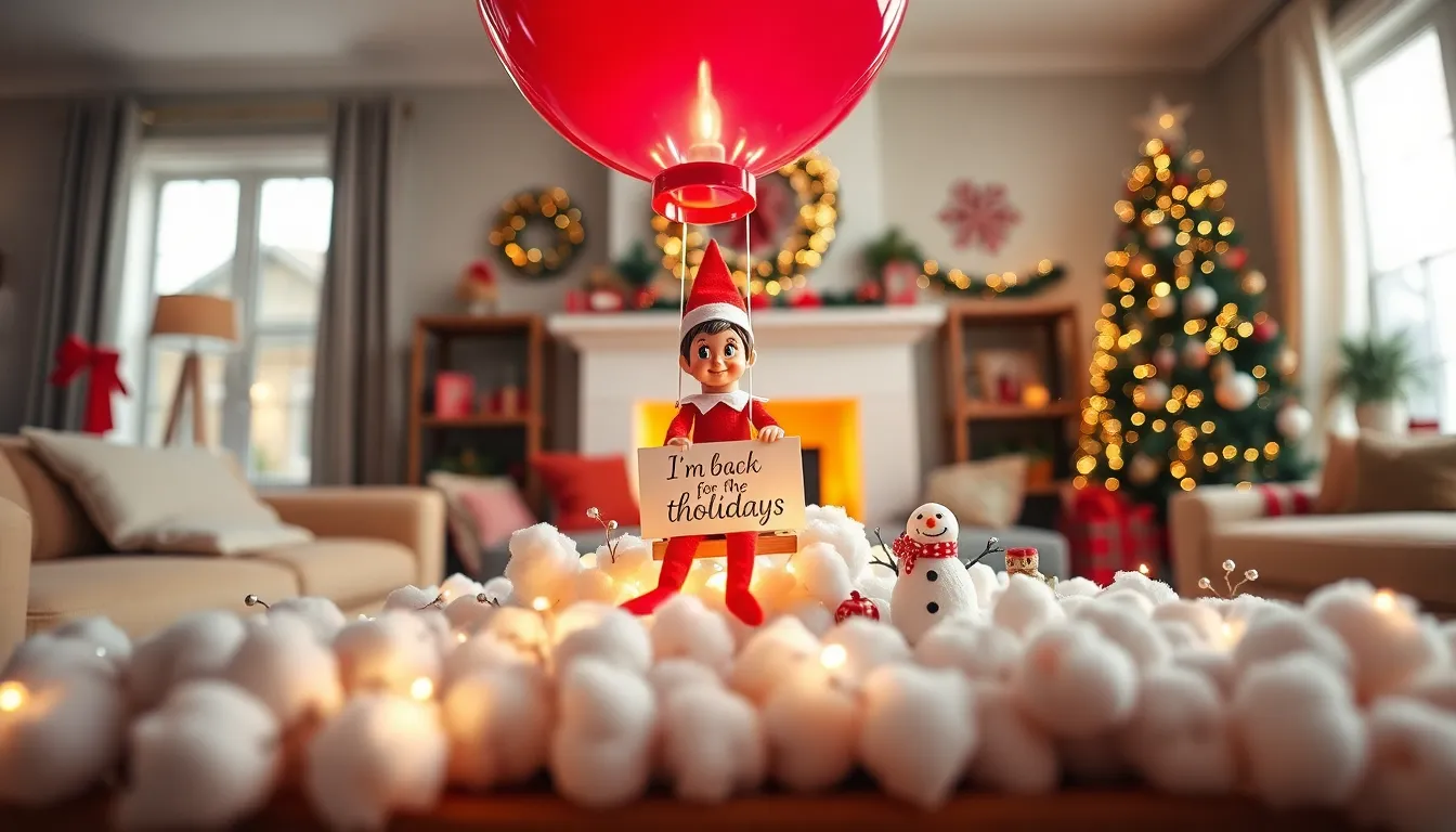 Imagine this: the elf floats down from a colorful balloon. Fill several balloons with helium and attach a small basket with the elf nestled inside. Tape a sign saying, “I’m back for the holidays.” Kids will adore the spectacle.