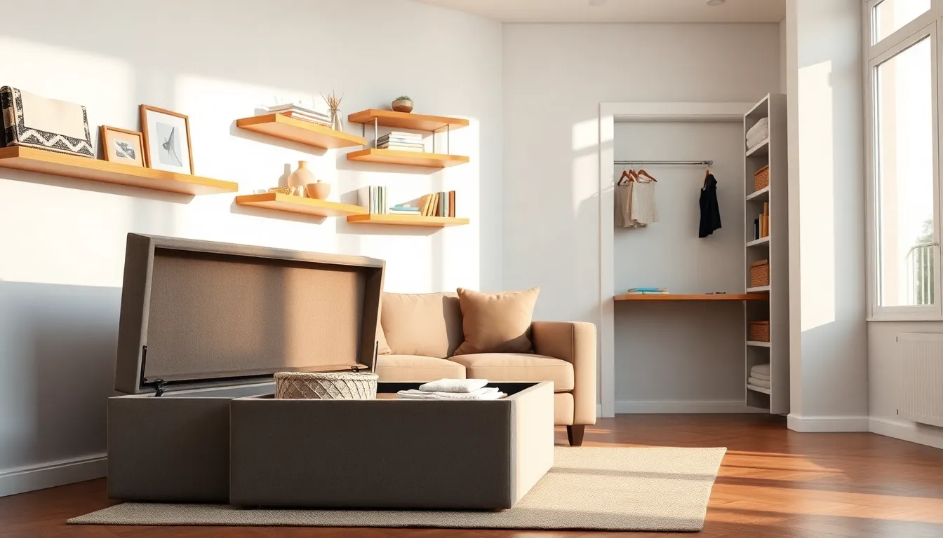 Coffee tables with shelves or drawers provide surface area and storage. Wall-mounted TV consoles keep floors clear. Decorative baskets hide clutter in plain sight. Floating media shelves replace bulky entertainment centers.